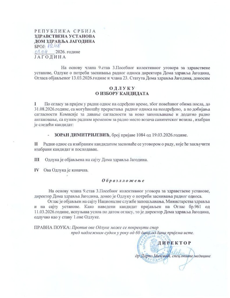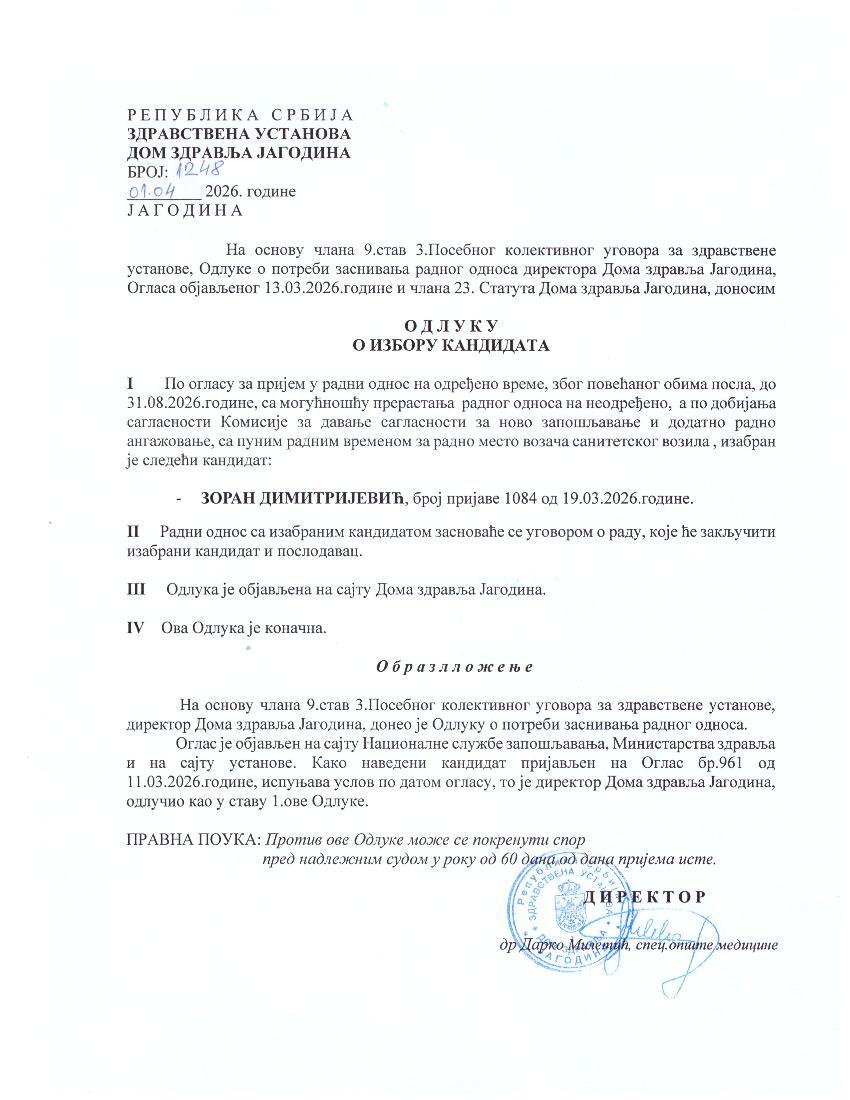 ОДЛУКА О ИЗБОРУ КАНДИДАТА