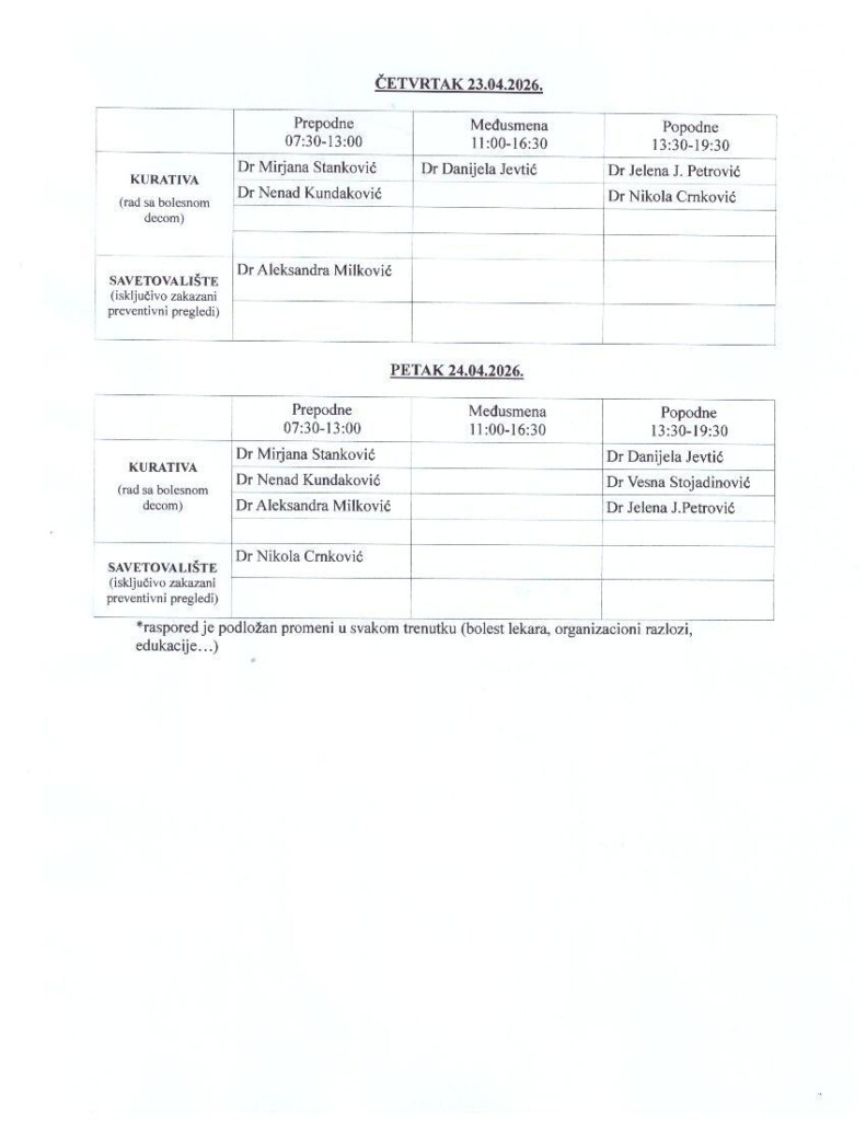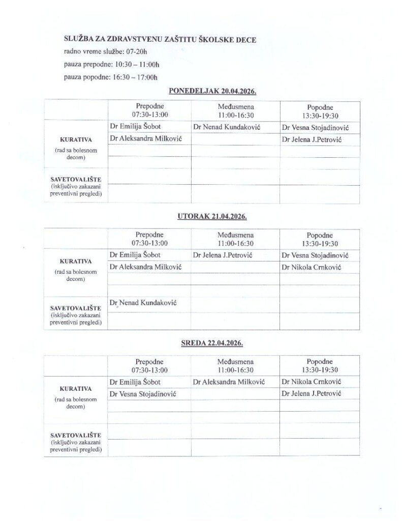 Распоред рада лекара – Служба здравствене заштите школске деце